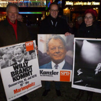 Unter den Anwesenden waren viele Ältere, die Willy Brandt in der Zeit seiner Kanzlerschaft erlebt haben und wegen seiner Politik der Entspannung damals in die SPD eingetreten sind. Auch der ehemalige Landtagsabgeordnete Hermann Memmel erinnert sich noch gut an persönliche Begegnungen mit Brandt. Am Infostand ließen sich dann Originalplakate aus den siebziger Jahren bestaunen, darunter ein Exemplar, das Brandt 1976 als Redner auf dem Marienplatz ankündigte. Stadtratskandidatin und BA-Mitglied Susan Beer und BA-Mitglied Michael Welzel versorgten währenddessen die feiernden Gäste mit Glühwein und Schokolade, sodass es sich am Willy-Brandt-Platz trotz der kalten Witterung gut verweilen ließ.